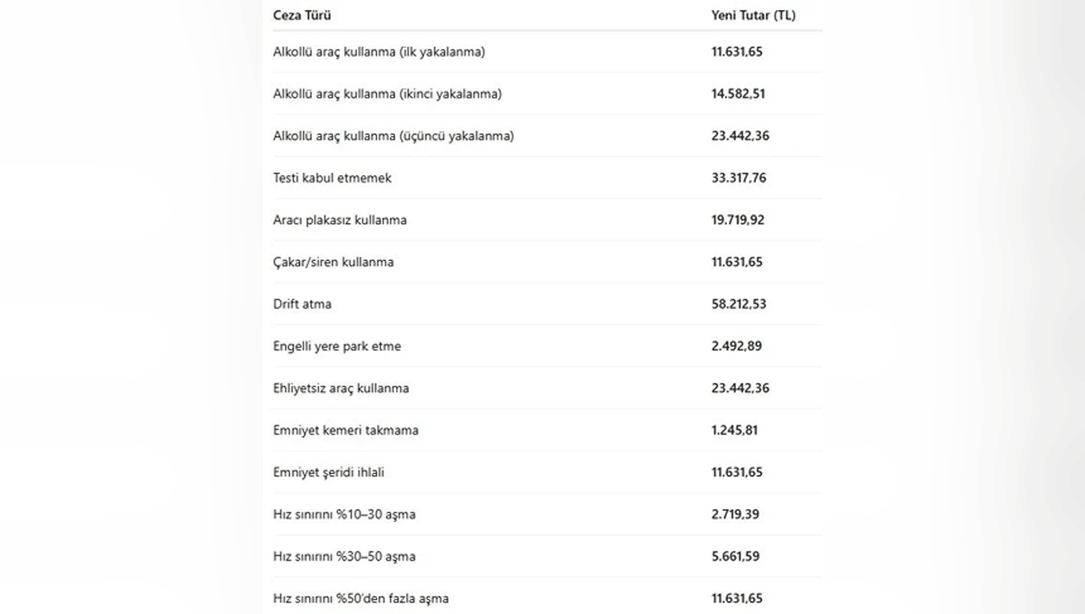 1 Ocak 2026 tarihi itibarıyla güncel trafik cezaları şu şekilde: