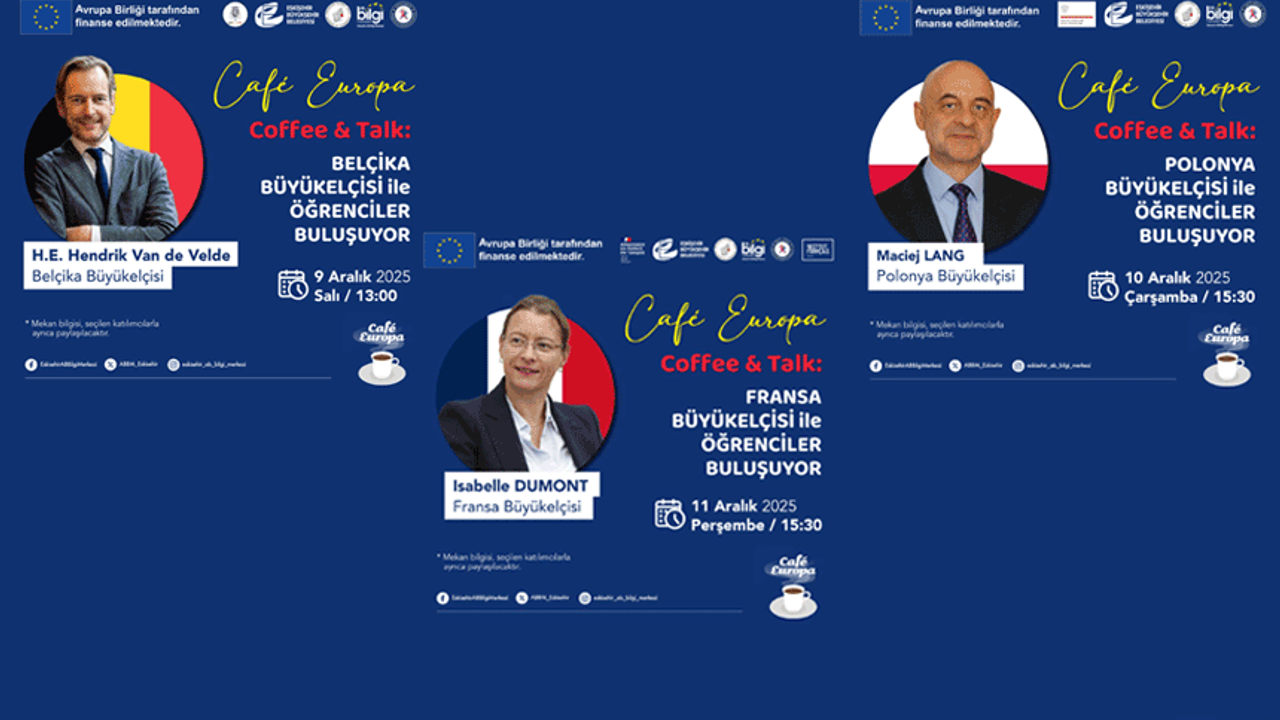 Eskişehir Ticaret Odası bünyesinde faaliyetlerini sürdüren Eskişehir AB Bilgi Merkezi, Eskişehir Büyükşehir Belediyesi Gençlik Merkezi’nin iş birliğinde uluslararası buluşmalara imza atıyor. Belçika, Polonya ve Fransa’nın büyükelçileri Café Europa – Coffee & Talk buluşmaları adı altında Eskişehir’e konuk oluyor. AB Türkiye Delegasyonu’nundesteği ile gerçekleşecek olan Café Europa – Coffee & Talk buluşmalarında, 9 Aralık Salı günü Belçika’nın Türkiye Büyükelçisi Hendrik Van De Velde gençlerle buluşacak. Buluşmada Büyükelçi Van De Velde, Belçika’nın AB vizyonu ve Türkiye–AB ilişkilerine bakışı, Gençler için Erasmus ve değişim programları, Avrupa’da genç olma deneyimi, Belçika–Türkiye gençliği arasında fırsatlar ve iş birlikleri konu başlıklarında gençlerin soruları yanıtlanacak.