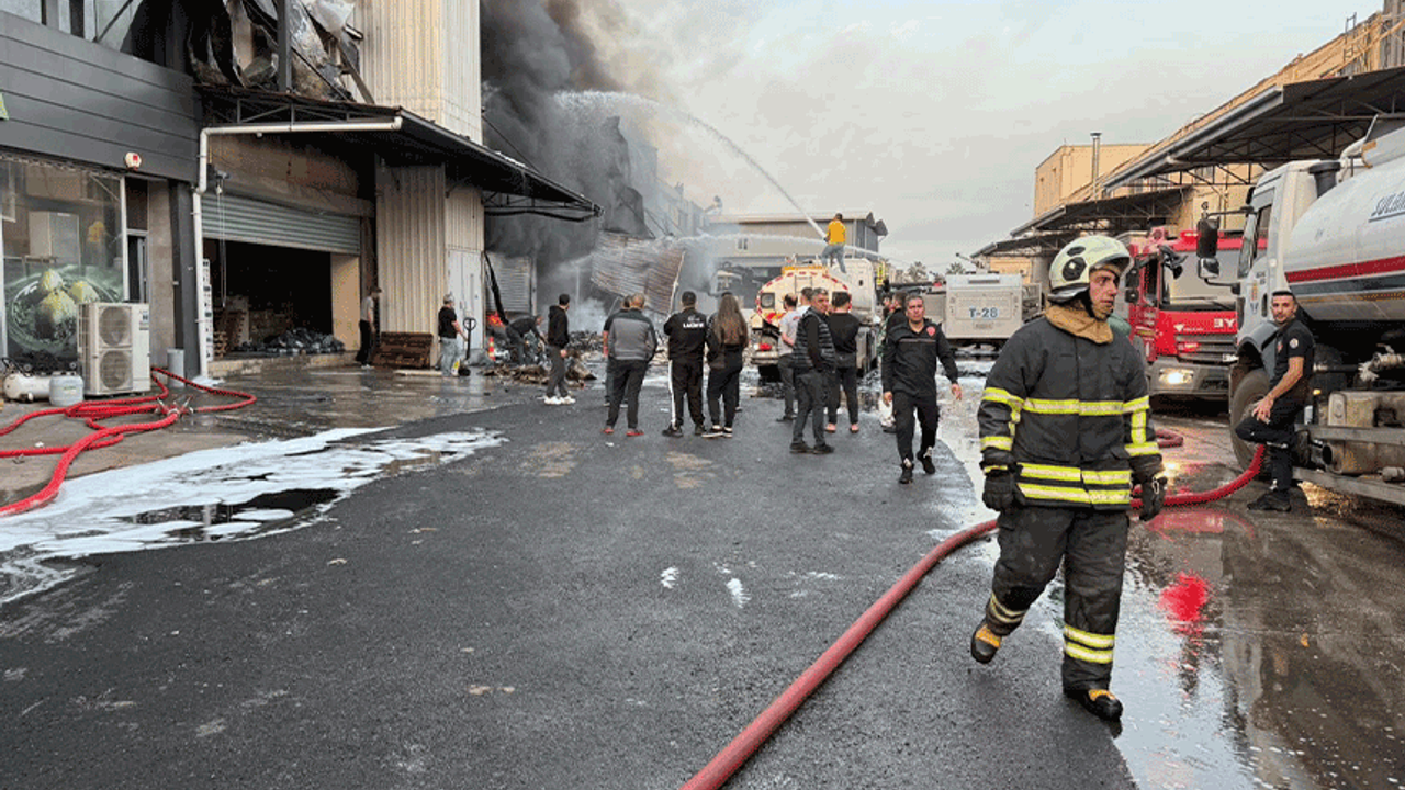 Bitişik iş yerlerine de sıçrayan yangında soğutma çalışmaları sürüyor.