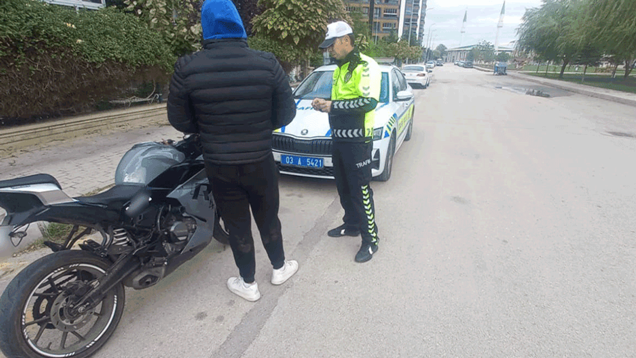 Edinilen bilgilere göre, Afyonkarahisar Maliye Kavşağı ışıklarında bekleyen ve üzerinde 2 kişinin bulunduğu motosikletin plakasının sarı renk bantla okunmasını güçleştirecek şekilde kapatıldığı ve trafikte kullanıldığı ihbarı üzerine polis ekipleri harekete geçti.