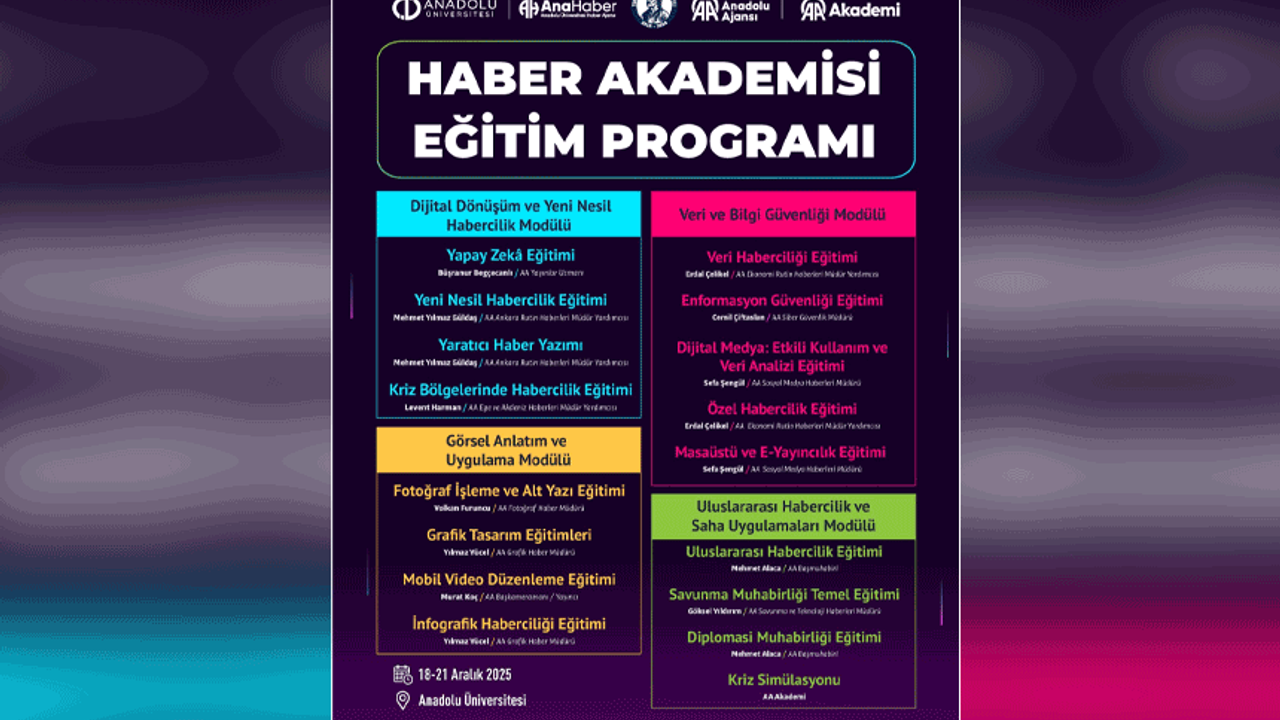 Anadolu Üniversitesi ile Anadolu Ajansı (AA) iş birliğinde düzenlenen “Haber Akademisi Eğitim Programı” bugün, başlıyor. Anadolu Üniversitesi Kurumsal İletişim Koordinatörlüğü bünyesinde faaliyet gösteren Anadolu Üniversitesi Haber Ajansı (AnaHaber) ile AA arasında gerçekleştirilen iş birliği kapsamında hayata geçirilen programın açılışı, Anadolu Üniversitesi İletişim Bilimleri Fakültesi Şener Şen Salonu’nda yapılacak. Eğitimler, dört gün boyunca İBF Frig Salonu’nda devam edecek. Program kapsamında AA’nın alanında uzman isimleri tarafından yapay zekâdan veri haberciliğine, kriz bölgelerinde gazetecilikten dijital ve sosyal medya haberciliğine kadar birçok başlıkta kapsamlı eğitimler verilecek.