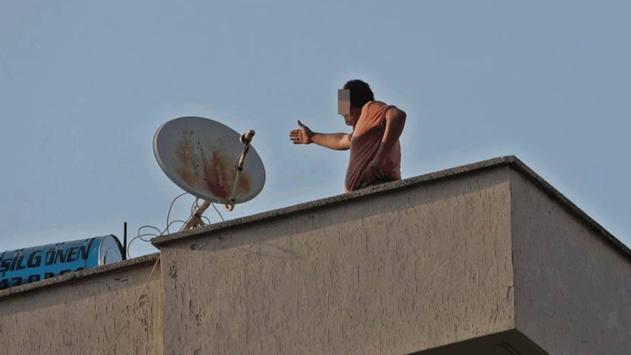 Bahadır T. zaman zaman çatıdaki korkuluklara çıkıp tehlikeli hareketlerde bulunurken, mahalleliler ise olan biteni meraklı gözlerle izledi.