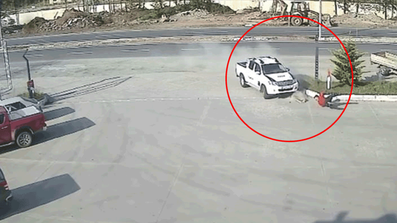 O anlar güvenlik kamerasına saniye saniye yansıdı. Görüntülerde, Yüksel Gaz'ın istasyon önünde beklediği sırada üzerine gelen aracın çarpması ve çarpmanın etkisiyle savrulması yer alıyor.