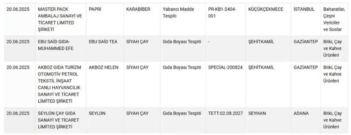 Bakanlığın yaptığı laboratuvar analizlerinde, bazı siyah çaylarda gıda boyası kullanıldığı, pekmez ürünlerinde şeker ilavesi yapıldığı ve öğütülmüş kırmızı biberlerde ise domates karışımı tespit edildi. Söz konusu ürünler, içeriğiyle oynanarak tüketiciyi yanıltacak hale getirildiği gerekçesiyle ifşa edildi.