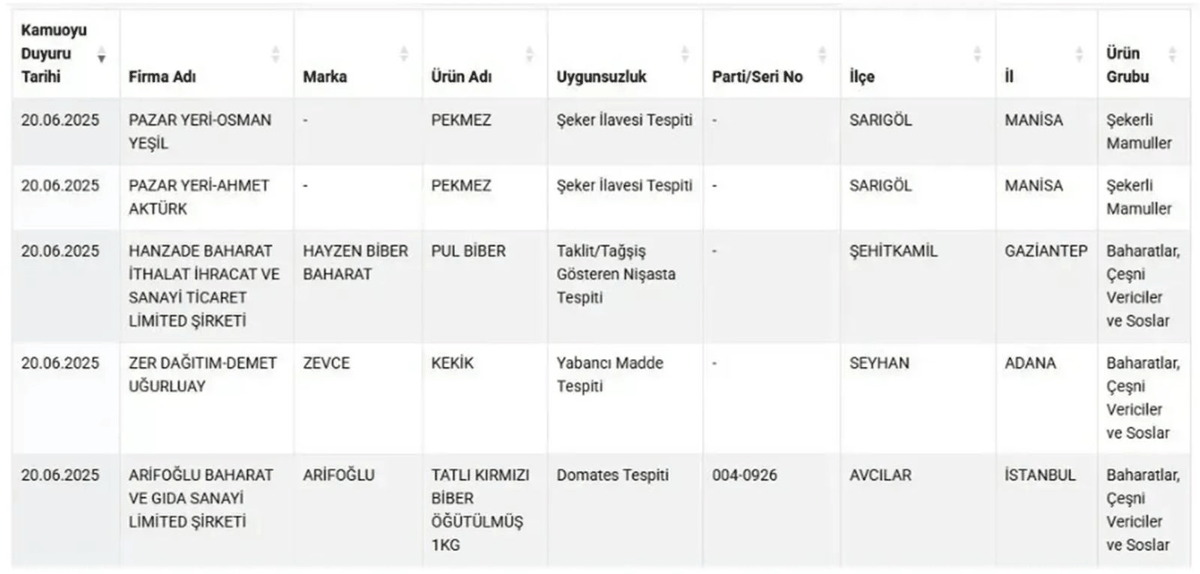 Tarım ve Orman Bakanlığı, vatandaşların güvenilir gıdaya ulaşabilmesi için sürdürdüğü denetimlerde sağlığı tehdit eden ürünleri bir kez daha kamuoyuyla paylaştı. Güncellenen listede, çeşitli firmalara ait bazı bitkisel ürünlerde ve gıdalarda taklit ve tağşiş yapıldığı belirlendi.