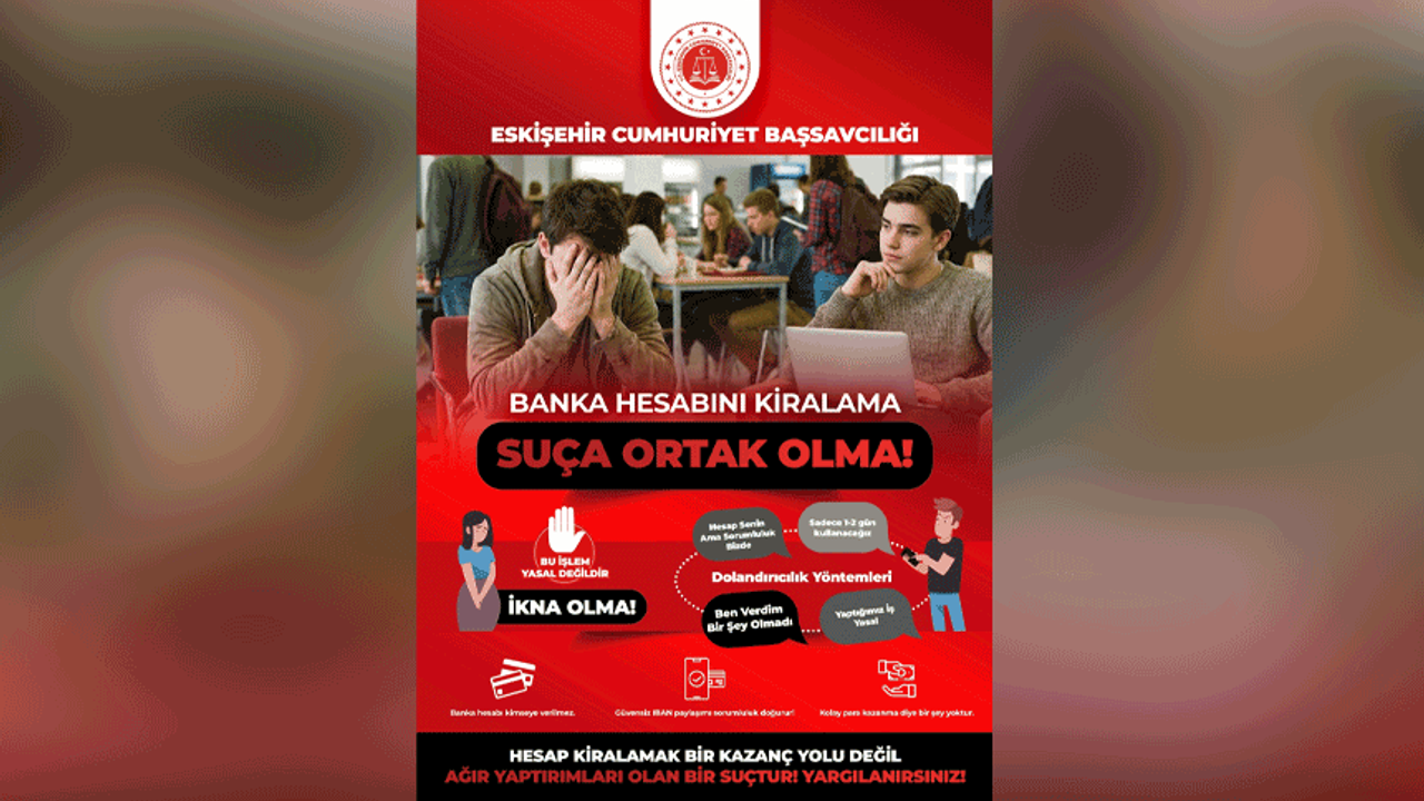 Konu ile ilgili açıklama yapan Eskişehir Cumhuriyet Başsavcısı Üzeyir Karakülah, bilişim sistemlerini kullanarak işlenen dolandırıcılık suçlarında, özellikle gençlerin banka hesaplarını kiralayarak birçok vatandaşın dolandırılmasına yardım ettiğini ifade ederek, “Günümüzde gittikçe artan dolandırıcılık olaylarında özellikle gençlerimizin banka hesaplarının kiralandığını, kullanıldığını tespit ediyoruz. Banka hesaplarını kiralayan ve kullandıran vatandaşlarımız da yıllarca hapis ve yüksek adli para cezası ile karşı karşıyalar. Hesaplarını kiralayarak işlenen suçlara dahil oluyor ve birçok mağduriyete yol açıyorlar. Bu konuda bir farkındalık oluşturmak adına çalışma başlattık. Vatandaşlarımızı bu konuda dikkatli olmaları için uyarıyoruz. Hesaplarını kimseye kullandırmasınlar. Banka kartı, IBAN, mobil bankacılık bilgilerini kimseyle paylaşmasınlar” diye konuştu.