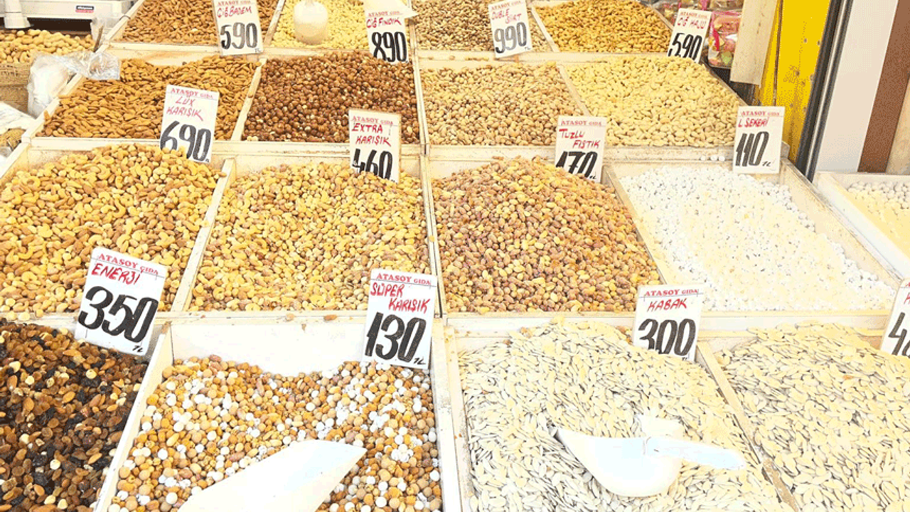 Kabak çekirdeği 300 TL, leblebi şekeri 110 TL, çiğ kaju 590TL, antep fıstığı 990 TL, çiğ fındık 890 TL, karışık kuruyemiş 690 TL, kuru üzüm karışık 350 TL, kayısı çekirdeği 350 TL, erik kurusu 270 TL, soslu fıstık 120 TL, badem 590 TL.