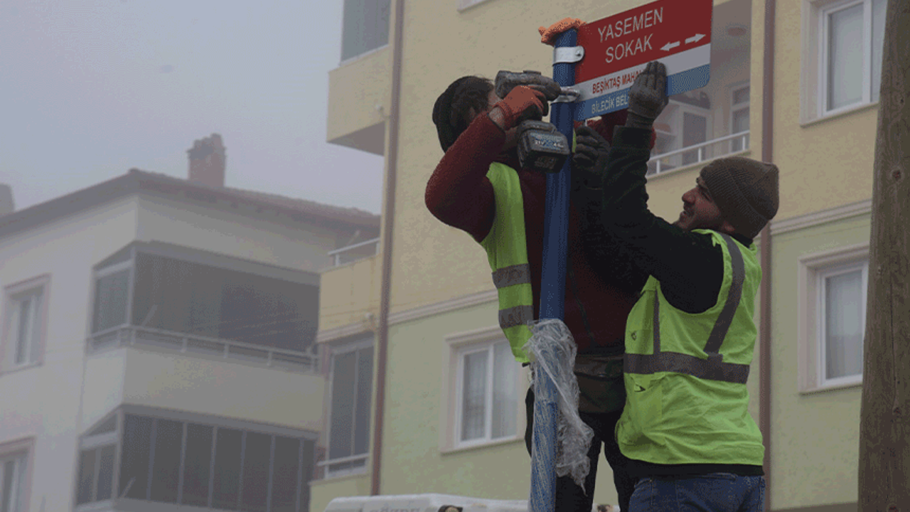 Kenttin dört bir köşesinde fiziki çalışmaları gerçekleştiren Bilecik Belediyesi Fen İşleri Müdürlüğü ekipleri güzel bir çalışmayı daha uygulamaya koyuyor. Beşiktaş Mahallesi’nde başlayan çalışma kapsamında hazırlanan yeni tabelalarda mahalle ismi yanı sıra cadde, sokak ve yön işareti yer alıyor.