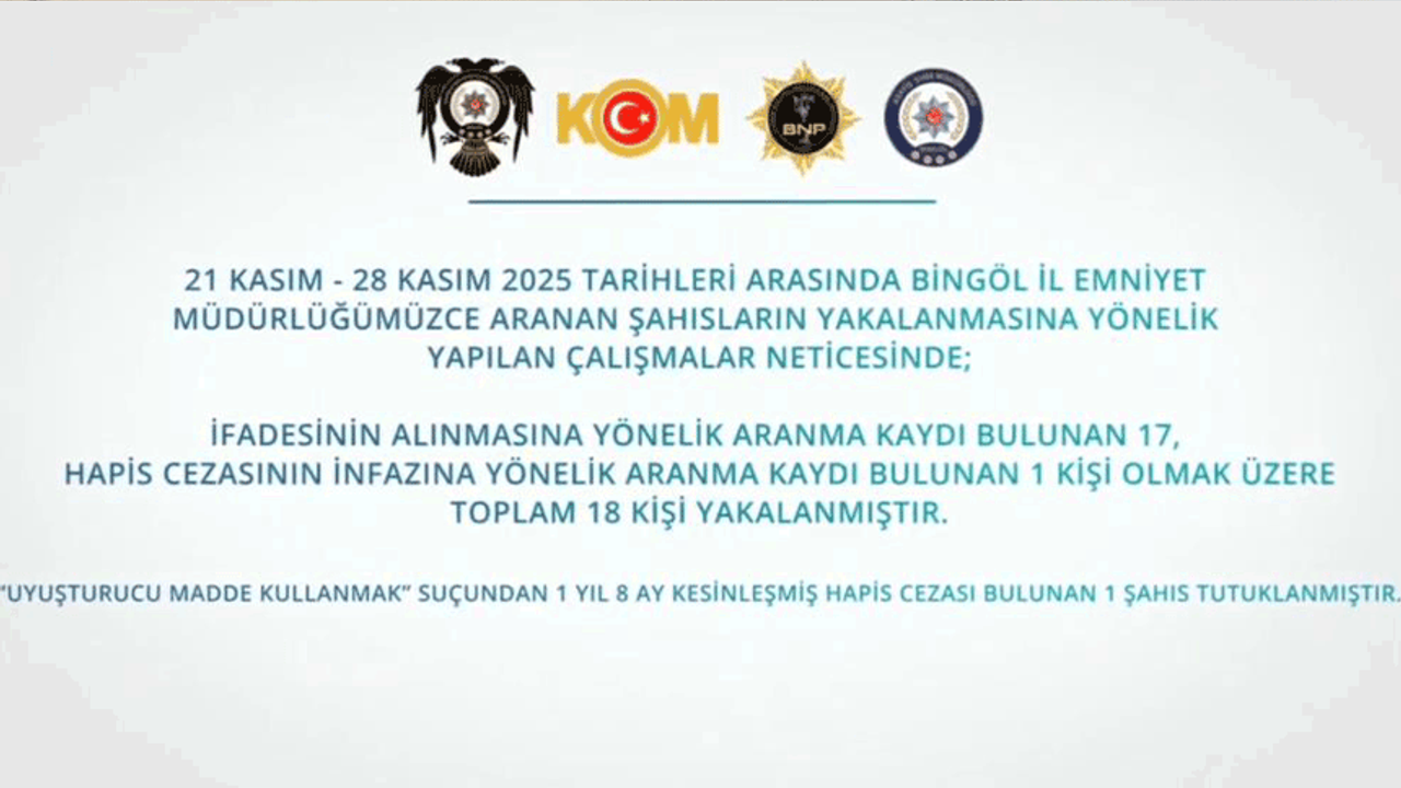 Bingöl İl Emniyet Müdürlüğü ekipleri, kent genelinde huzur ve güven için çalışmalarını aralıksız sürdürüyor. Bu çerçevede 21-28 Kasım tarihleri arasında yapılan çalışmalarda aranan 18 şüpheli yakalandı. Ayrıca TEM, KOM, Narkotik ve Siber Suçlarla Mücadele ile Asayiş Şube Müdürlükleri tarafından yapılan çalışmalarda 17 şüphelinin yakalandığı bildirildi. Çalışmalarda 8,07 gram kubar esra, 1,55 gram metamfetamin, kaçak sigara ve tütün, 1 adet av tüfeği, 1 adet ruhsatsız tabanca, 1 adet sahte plakalı aracın ele geçirildiği aktarıldı.