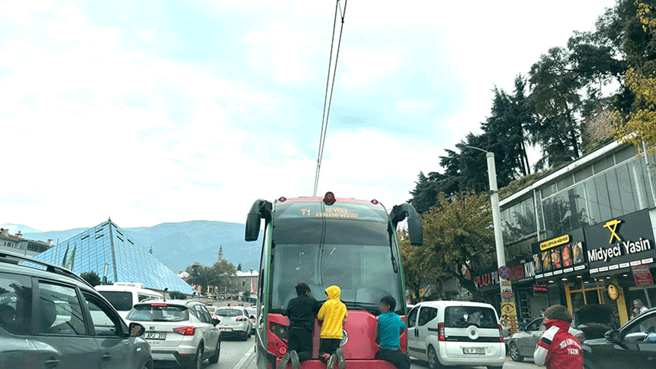 Olay, Bursa Osmangazi ilçesinde meydana geldi. Dört çocuk, hareket halindeki bir tramvayın arkasına tutunarak dakikalarca yolculuk yaptı. Trafikte ilerleyen çocukların rahat tavırları pes dedirtirken o anları gören sürücüler büyük şaşkınlık yaşadı. Her an düşüp ağır şekilde yaralanma riski taşıyan çocukların tehlikeli yolculuğu cep telefonu kamerasıyla kaydedildi. Görüntülerde tramvayın arkasına sıkı sıkıya tutunan çocukların uzun süre bu şekilde ilerlediği anlar yer aldı.