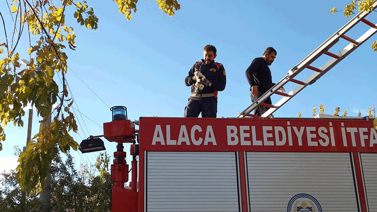 Çorum'un Alaca ilçesi Necmettin Erbakan Parkı’nda tırmandığı ağacın dalında mahsur kalan yavru kediyi fark eden vatandaşlar, durumu 112 Acil Çağrı Merkezi’ne bildirdi. İhbar üzerine bölgeye gelen Alaca Belediyesi itfaiye ekipleri, merdiven yardımıyla kediyi bulunduğu yerden indirdi. Kurtarılan yavru kedi, sağlık durumunun iyi olduğu belirlenmesinin ardından doğal yaşam alanına bırakıldı.