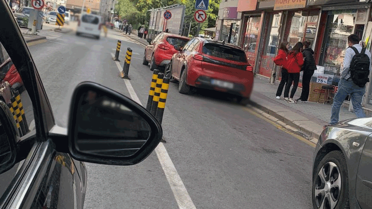 Eskişehir’de İbrahim Karaoğlanoğlu Caddesi’nde dubalarla bölünmüş yolda park yasağı tabelasına rağmen araçların park etmiş olduğu görülürken, diğer sürücüler araç parkları nedeniyle daha çok daralan yollardan geçmekte zorlandı.