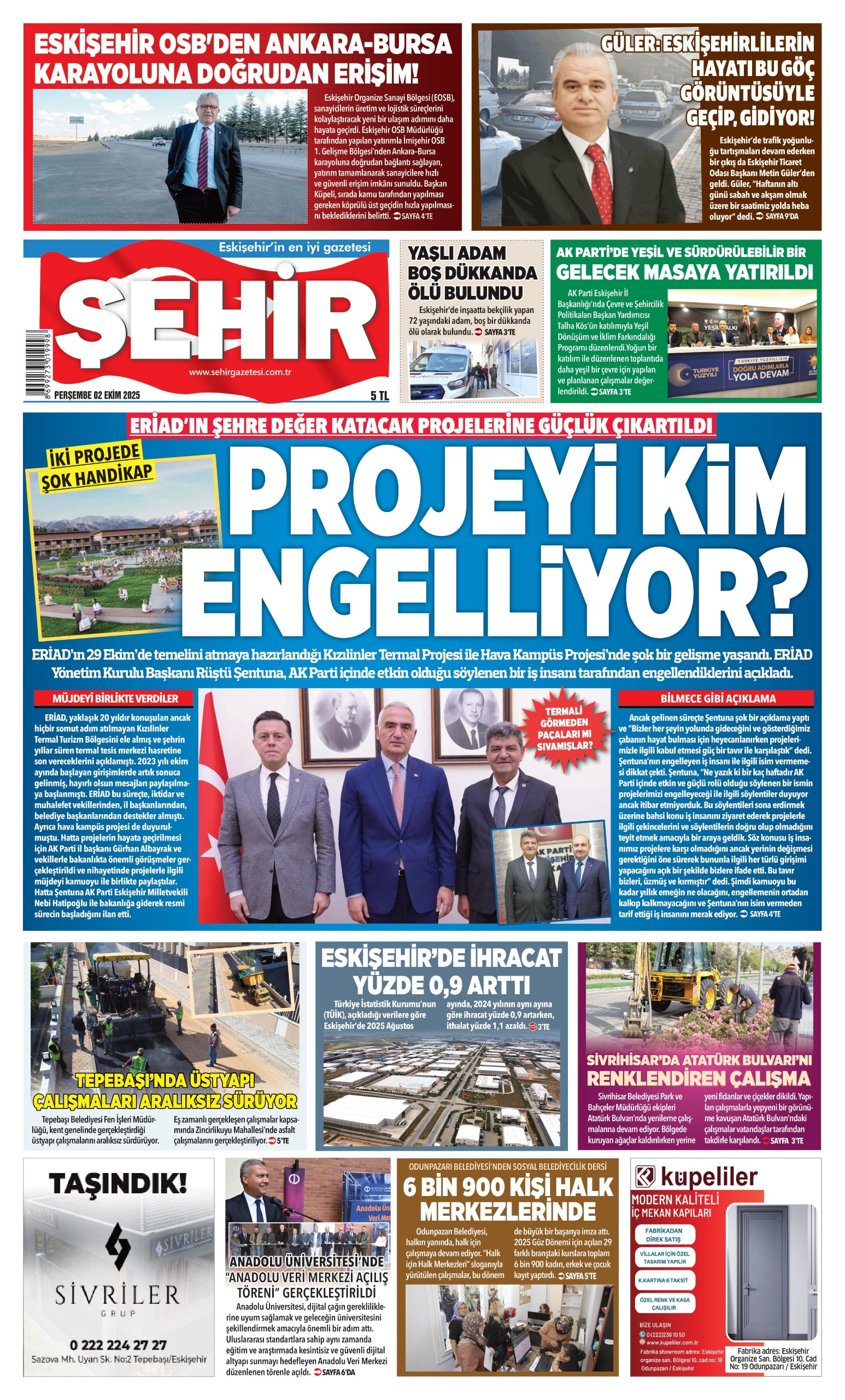 Şehir Gazetesi 2 Ekim 2025 Perşembe tarihli sayısı