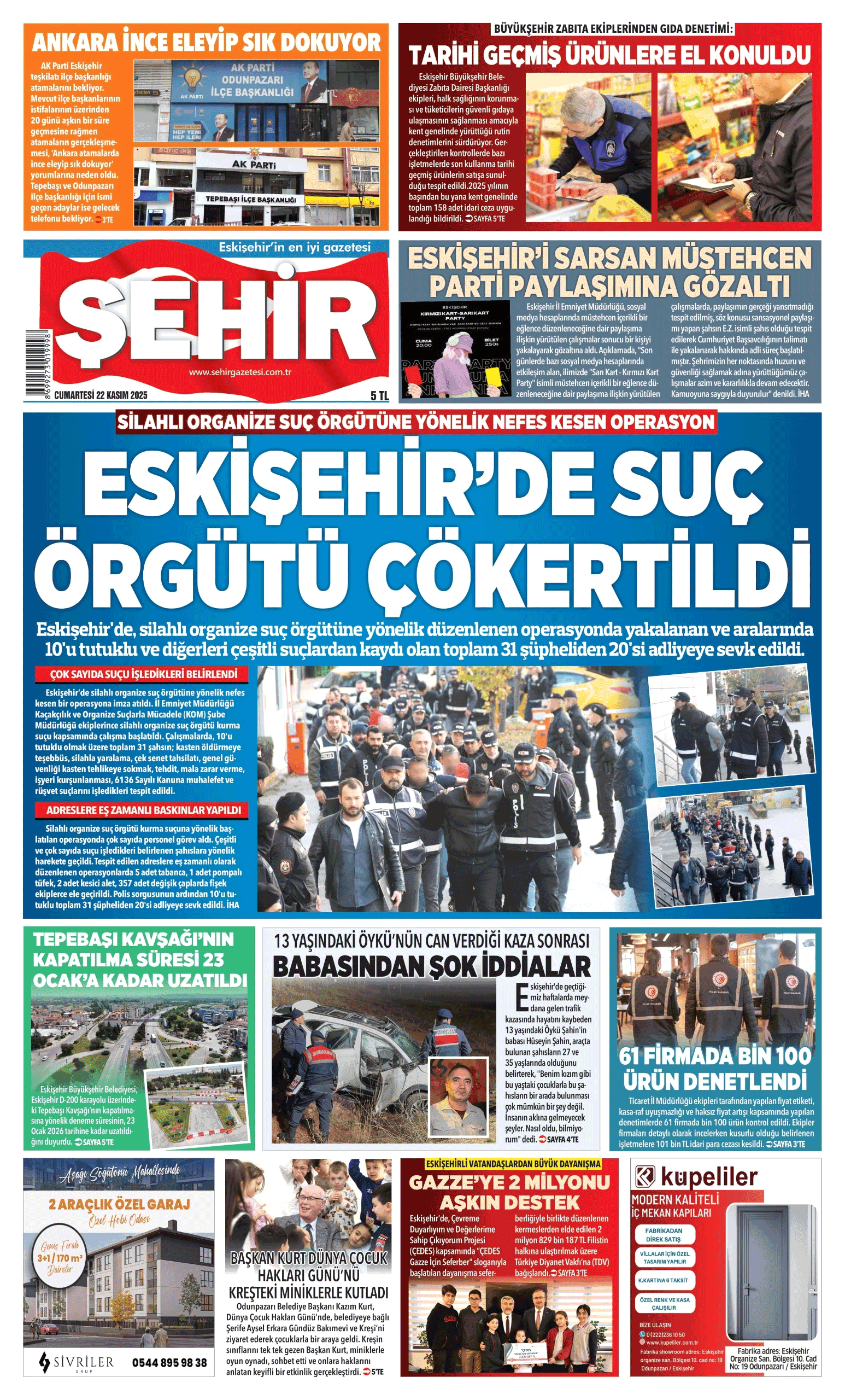Şehir Gazetesi 22 Kasım 2025 Cumartesi