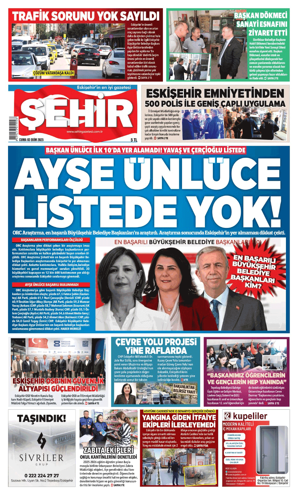 Şehir Gazetesi 3 Ekim 2025 Cuma