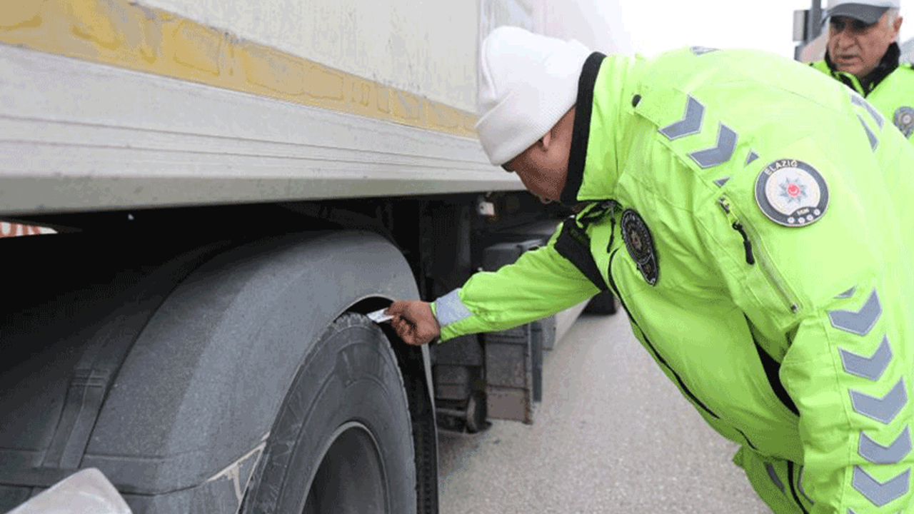 Ticari araçlar için kış lastiği takma zorunluluğu 15 Kasım itibarıyla ülke genelinde başladı. Elazığ İl Emniyet Müdürlüğü Bölge Trafik Denetleme Şube Müdürlüğü ekipleri de kış lastiği uygulaması denetimlerine başladı. Denetimlerde ekipler, tek tek lastikleri kontrol etti. Uygulamanın 15 Nisan 2026'ya kadar devam edeceğini aktaran ekipler, sürücülere bilgilendirici broşürler dağıttı. Kış lastiği takmayan sürücülere ise 5 bin 856 lira ceza kesildi.