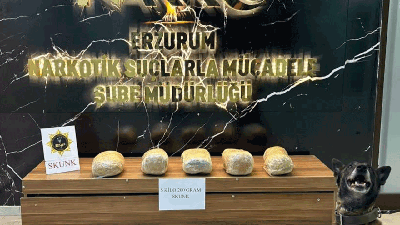 Edinilen bilgiye göre, Erzurum İl Emniyet Müdürlüğü Narkotik Suçlarla Mücadele Şube Müdürlüğü ekiplerince narkotik köpeği Magnum ile yapılan çalışmalarda 5 kilo 200 gram skunk maddesi ele geçirildi. Uyuşturucuyla ilgili gözaltına alınan A.K. (24) ve M.S.E. (24), sevk edildikleri adli makamlarca tutuklanarak cezaevine teslim edildi.