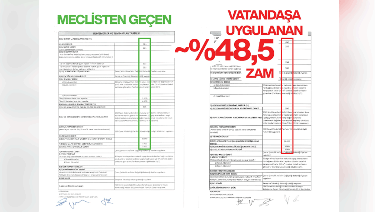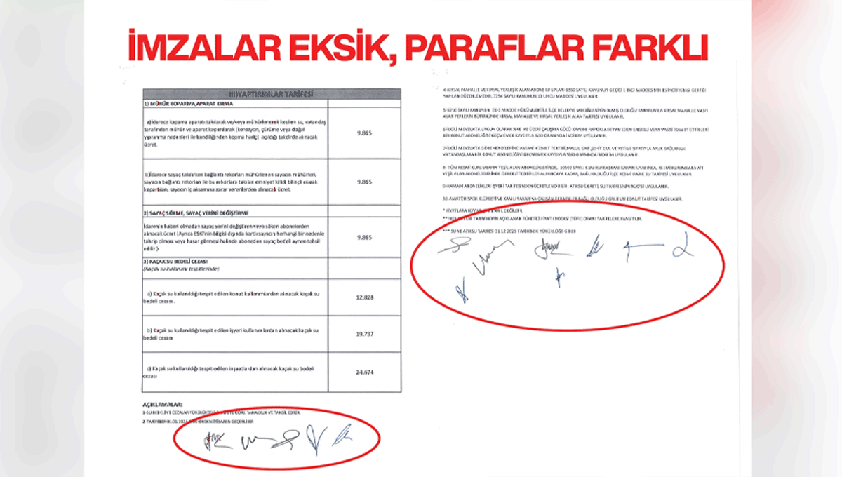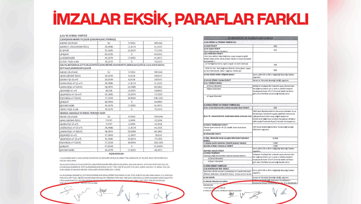 Bu şüphelerimizi destekleyen en somut husus ise Komisyon Kararı dosyasındaki dikkat çekici tutarsızlıklardır. Karar metninin genelinde ve "Su ve Atıksu Tarifesi" gibi diğer sayfalarda tüm komisyon üyelerinin (8 kişi) tam imzası ve parafı bulunurken; fiyatların %48,5 oranında artırıldığı kritik sayfalarda paraf sayısının 5’e düşmesi ve imza düzeninin bozulmuş olması, bu sayfaların "sonradan ihdas edildiği" yönünde açık bir emaredir.