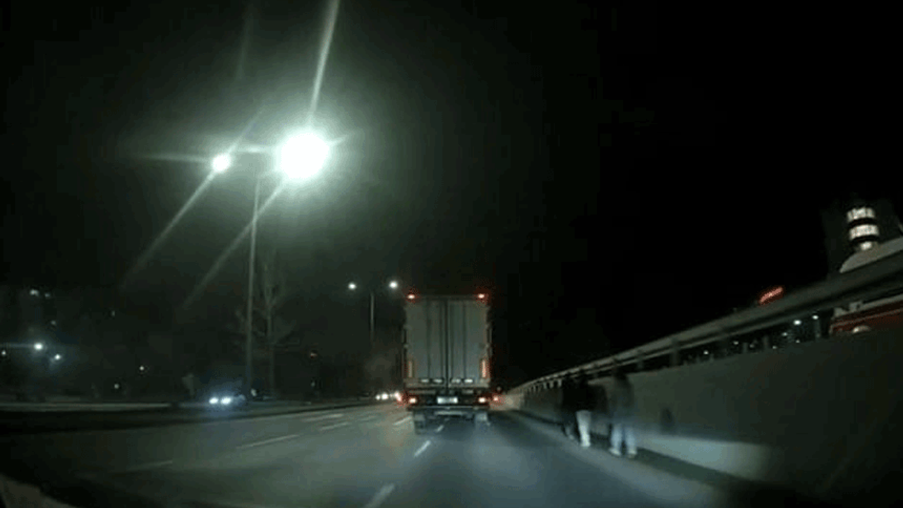 Ağır vasıta araçlarının ve otomobillerin yüksek süratle seyrettiği bölgede yürüyen şahısların, fark edilmelerini sağlayacak hiçbir reflektörlü kıyafet taşımamaları tehlikeyi iki katına çıkardı. O esnada yolda ilerleyen bir kamyon şoförü, karanlıkta adeta "görünmez" olan yayaları son anda fark etti. Şoförün dikkati ve ani manevrası sayesinde şahıslara çarpmaktan son saniyede kurtulduğu anlar, çevredeki vatandaşların kamerasına yansıdı.