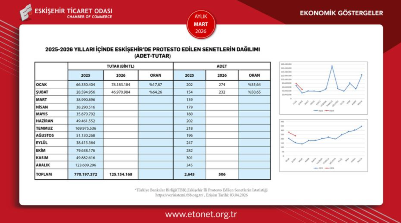 Eskişehir Ticaret Odası Başkanı Metin Güler, kent ekonomisine ilişkin önemli bir veriyi kamuoyuyla paylaştı. Güler’in açıkladığı rakamlara göre, Şubat ayında Eskişehir’de protesto edilen senet tutarı geçen yılın aynı dönemine göre yüzde 64,26 oranında artarak 46 milyon 970 bin 984 liraya ulaştı.
