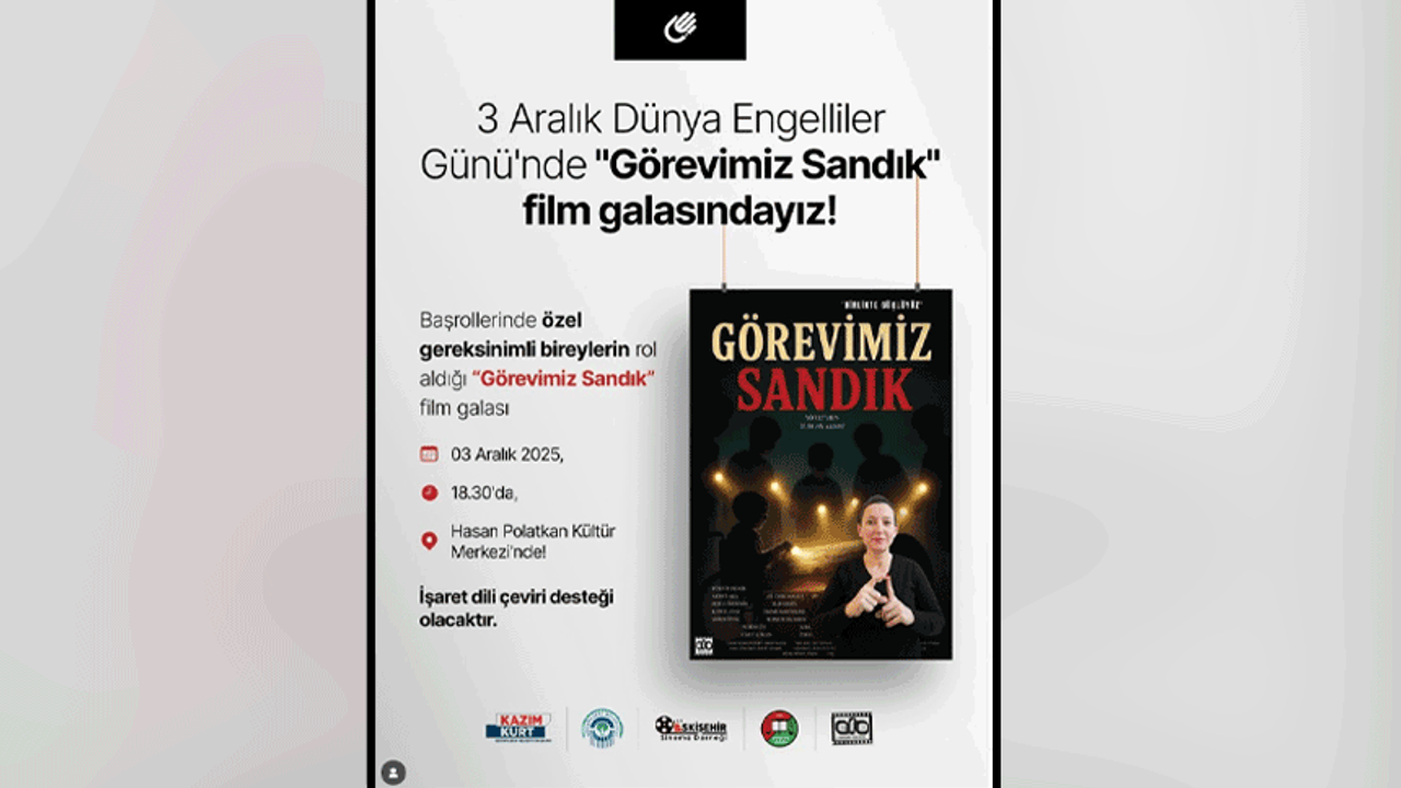 Eskişehir Engelsiz Kültür ve Sanat Merkezi’nin yürüttüğü “Kamera Benimle” kısa film atölyesinde hazırlanan ve başrollerinde özel gereksinimli bireylerin yer aldığı “Görevimiz Sandık” filminin galası, 3 Aralık Dünya Engelliler Günü'nde Hasan Polatkan Kültür Merkezi’nde izleyiciyle buluşacak. Hem üretim süreci hem de oyuncu kadrosuyla dikkat çeken film, özel gereksinimli bireylerin sanatla buluşmasına önemli bir katkı sunuyor. Gala sırasında işaret dili çeviri desteği sağlanarak tüm katılımcıların etkinliği erişilebilir bir şekilde takip edebilmesi hedefleniyor.