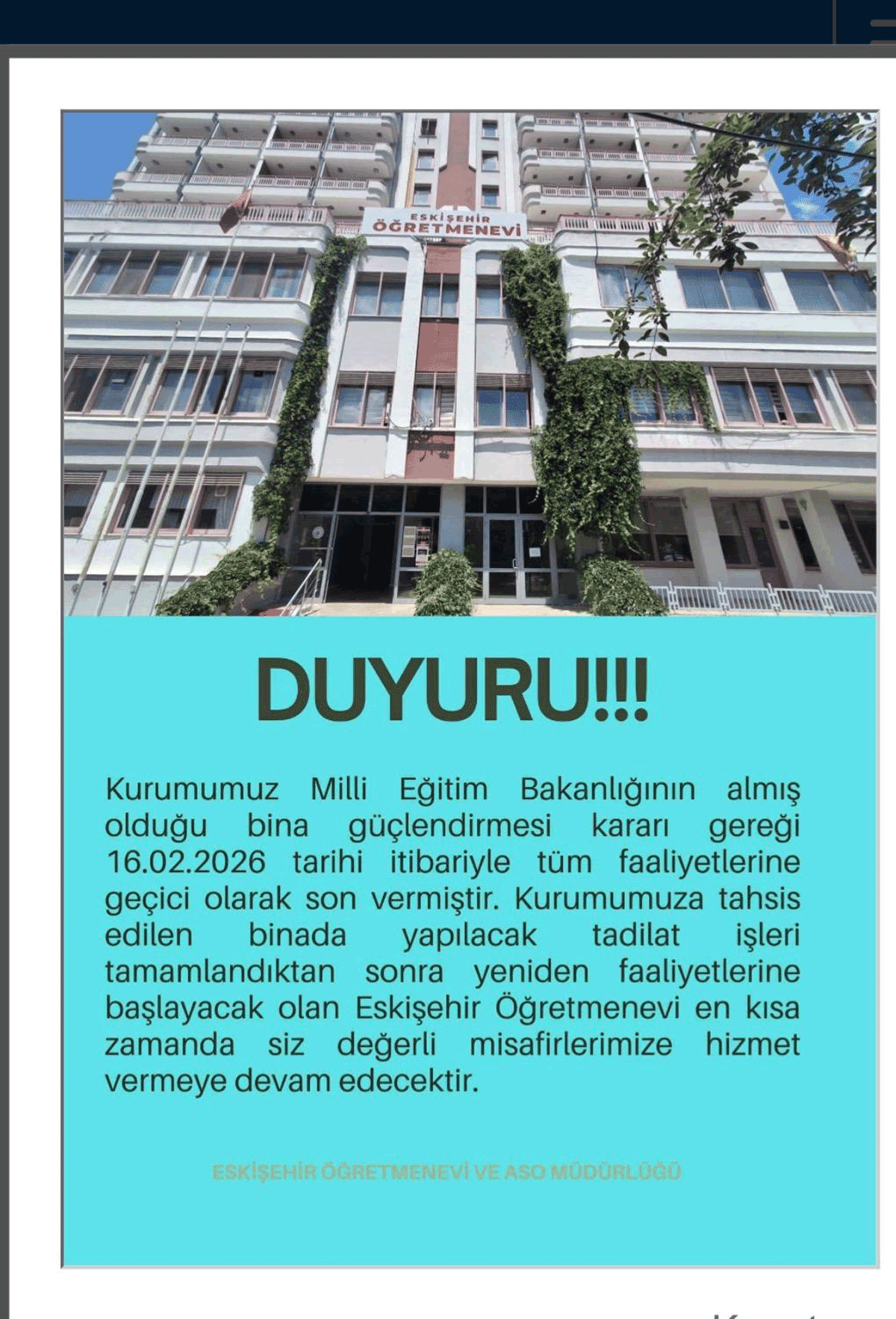 Binaya asılan yazıda “Kurumumuz Milli Eğitim Bakanlığı’nın almış olduğu bina güçlendirme çalışması kararı gereği 16 Şubat 2026 tarihi itibariyle tüm faaliyetlerine geçici olarak son vermiştir. Kurumumuza tahsis edilen binada yapılacak olan tadilat işleri tamamlandıktan sonra yeniden faaliyetlerine başlayacak olan Eskişehir Öğretmenevi en kısa zamanda siz değerli misafirlerimize hizmet vermeye devam edecektir” bilgilerine yer verildi.