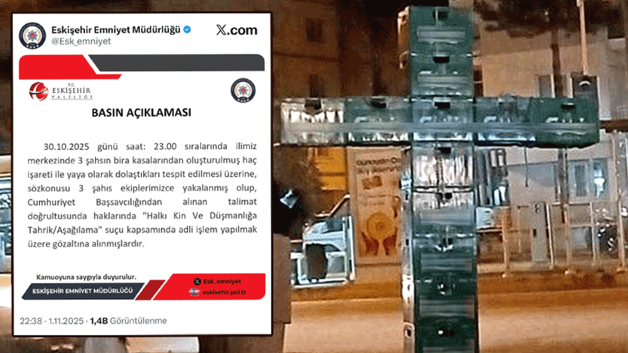 Valiliğin açıklamasında, “30.10.2025 günü saat 23.00 sıralarında ilimiz merkezinde 3 kişinin bira kasalarından oluşturulmuş haç işareti ile yaya olarak dolaştıkları tespit edilmesi üzerine, söz konusu 3 kişi ekiplerimizce yakalanmış olup, Cumhuriyet Başsavcılığından alınan talimat doğrultusunda haklarında ‘Halkı Kin Ve Düşmanlığa Tahrik/Aşağılama’ suçu kapsamında adli işlem yapılmak üzere gözaltına alınmışlardır” denildi.
