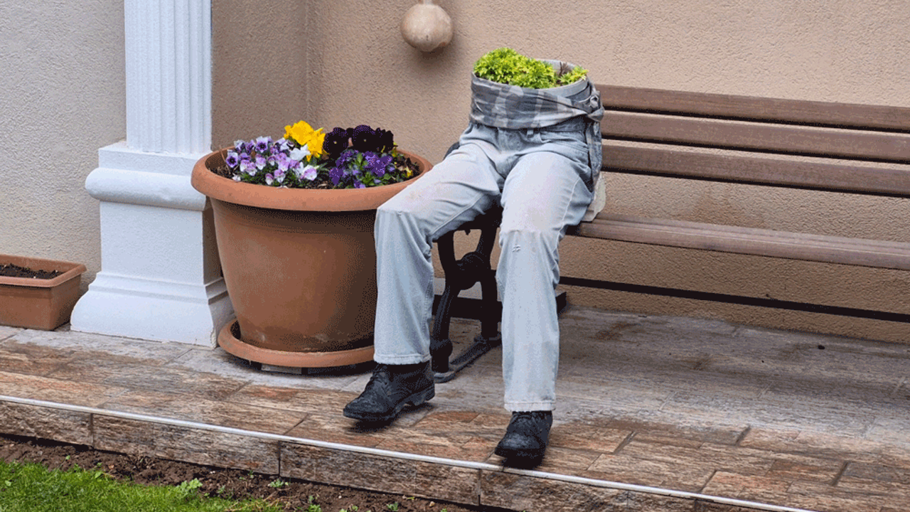 Ertuğrulgazi Mahallesi Şanver Sokak'ta bulunan bir evin bahçesindeki bankın üzerine yerleştirilen dekorasyon göze çarptı. Ayakkabı, pantolon ve saksı birleştirilerek yapılan dekorasyon, sanki bankın üzerinde oturan birisi varmış gibi görüntü oluşturdu. İnsan figürlü saksı, hem ilginç, hem de ürkünç yönüyle çevreden geçenlerin dikkatini topladı.