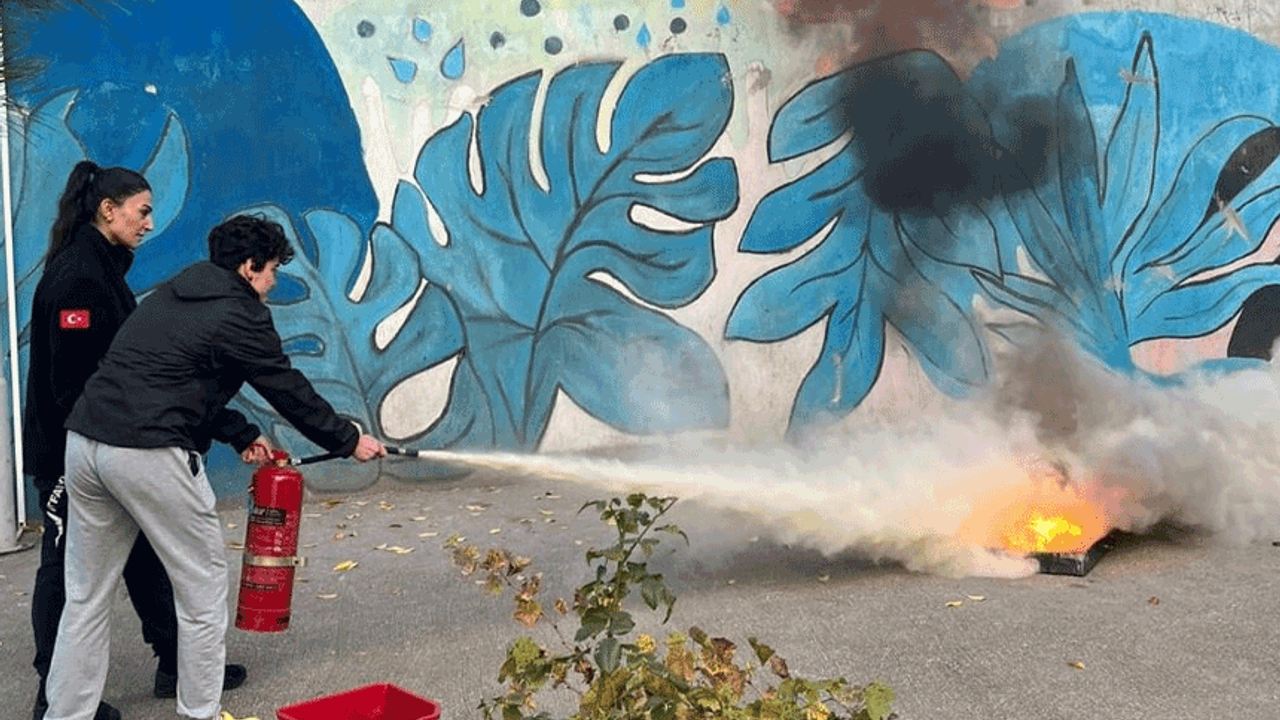 Eğitime katılan öğrenciler ve personel, yangın söndürme uygulamasını bizzat deneyimleme fırsatı buldu.