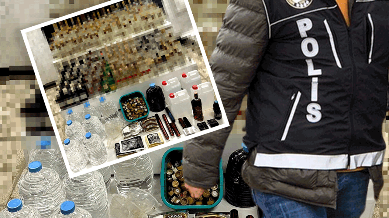 Teknik ve fiziki takibin ardından şüphelilerin ikametlerine eş zamanlı operasyon düzenleyen ekipler, aramalarda adeta bir imalathane ile karşılaştı. Yapılan aramalarda; 330 adet sahte içki etiketi, 300 adet sahte içki jelatini, 290 adet sahte içki şişesi, 156 adet sahte içki kapağı, 150 adet sahte içki kapüşonu, 65 litre etil alkol, 21 litre sahte viski, 2 adet huni ve 1 şişe viski aroması ele geçirildi.