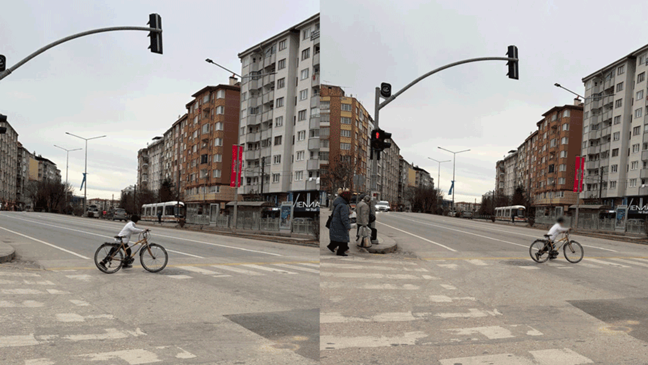 Eskişehir’in Odunpazarı ilçesinde, Alanönü Tramvay Durağı yakınında akşam iş çıkış saatlerinde dikkat çeken bir trafik ihlali yaşandı. Yoğunluğun arttığı saatlerde bisikletiyle karşıya geçmek isteyen bir çocuk, yaya için kırmızı ışık yanmasına rağmen yeşil ışığı beklemeden yola çıktı.