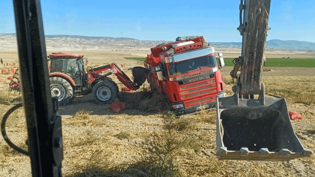 Olay, Mihalıççık ilçesi Kayı Mahallesi, Kırı mevkiinde meydana geldi. Edinilen bilgilere göre, yaklaşık 22 ton soğan yüklü olan tır arazinin ıslak zeminde ilerlerken bir anda toprağa gömüldü. Bu esnada devrilme tehlikesi yaşayan tırı iş makineleri ile battığı yerden çıkarıldı.