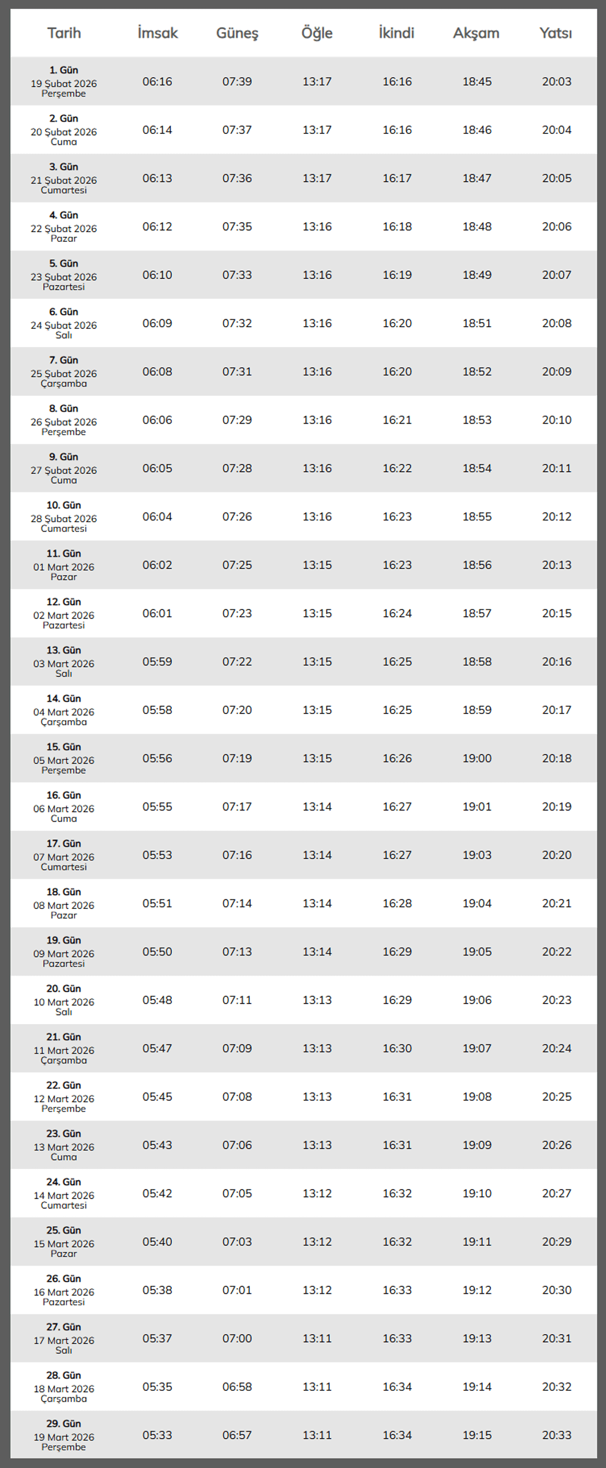 İlk teravih namazı ise 18 Şubat Çarşamba kılınacak. Kur’an-ı Kerim’de “Bin aydan daha hayırlı” olduğu bildirilen Kadir Gecesi, 16 Mart 2026 Pazartesi günü idrak edilecek. Ramazan Bayramı ise 20 Mart 2026 Cuma günü başlayacak ve üç gün sürecek.