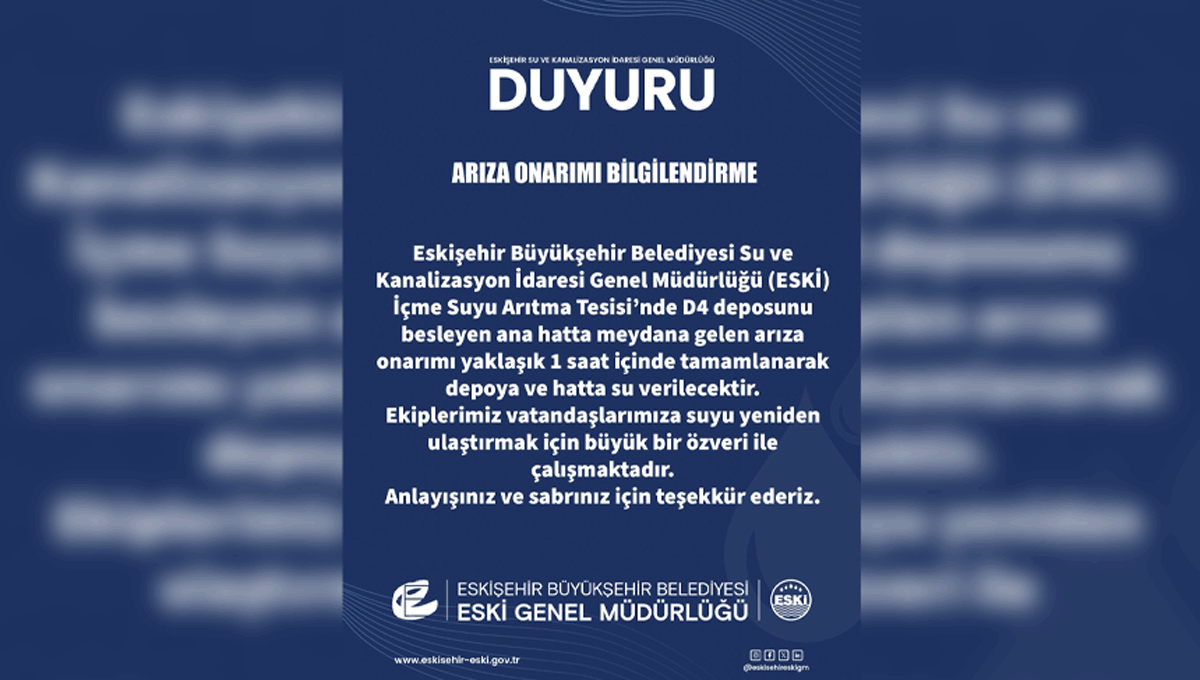 ESKİ tarafından yapılan bilgilendirmede, arıza onarım çalışmalarının yaklaşık 1 saat içerisinde tamamlanacağı, ardından depoya ve hatta yeniden su verileceği belirtildi. Açıklamada, ekiplerin suyu mahallelere yeniden ulaştırmak için yoğun ve özverili bir çalışma yürüttüğü vurgulandı.