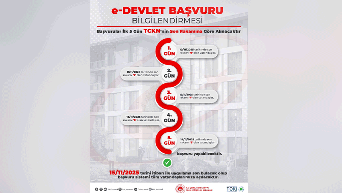 Cumhurbaşkanı Recep Tayyip Erdoğan tarafından geçtiğimiz günlerde açıklanan “Yüzyılın Konut Projesi” için başvuru tarihleri duyuruldu. TOKİ tarafından yapılan bilgilendirmeye göre başvurular 10 Kasım 2025 tarihinden itibaren başlayacak ve TC kimlik numarasının son rakamına göre alınacak.