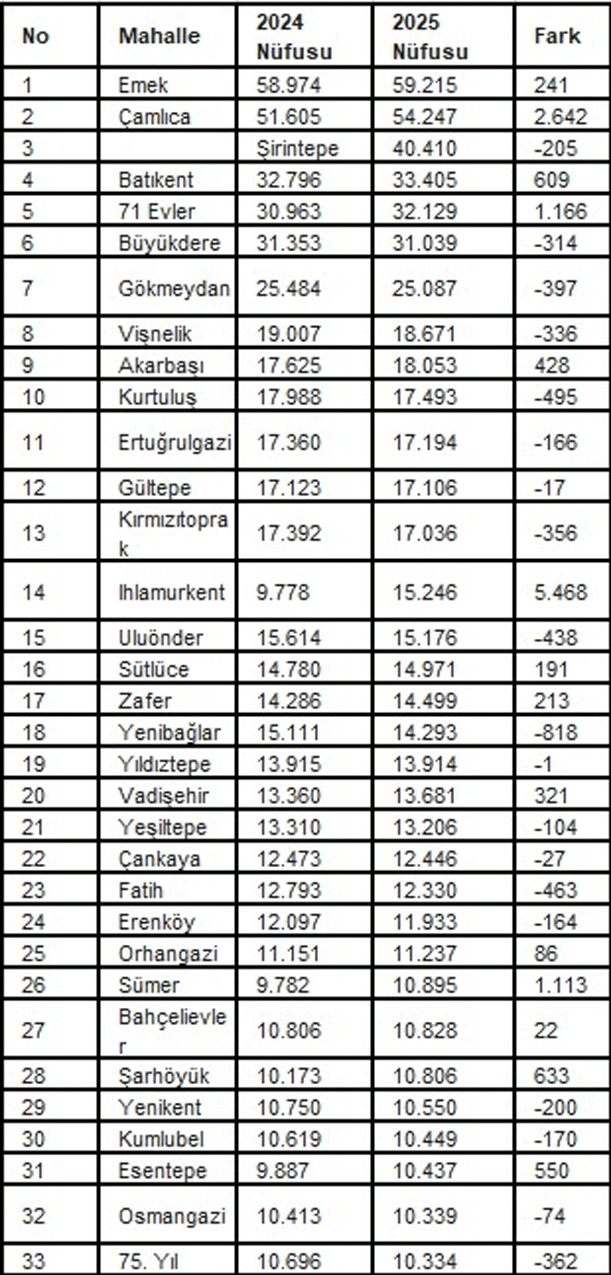 Nüfusu 10 bin ve üzeri olan mahalleler incelendiğinde en dikkat çekici artış Ihlamurkent Mahallesi’nde görüldü. Mahallenin nüfusu bir yılda 5 bin 468 kişi artarak 9 bin 778’den 15 bin 246’ya çıktı.
