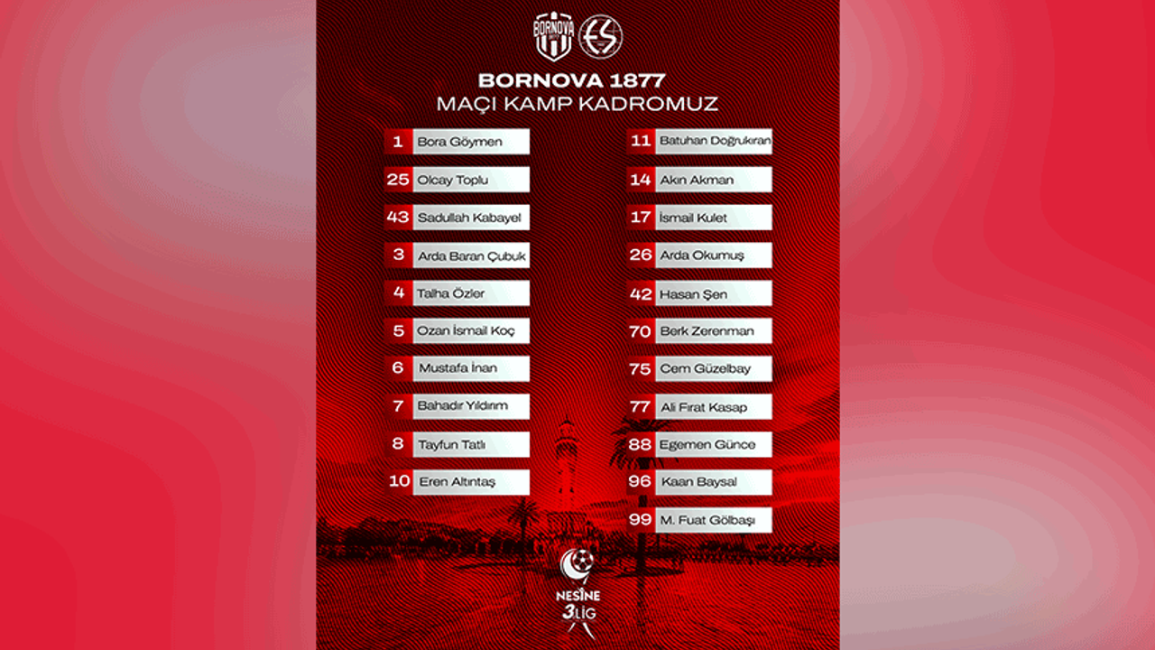 TFF 3. Lig 4. Grup’ta 9. hafta mücadelesinde Eskişehirspor, 2 Kasım Pazar günü Bornova 1877 SK deplasmanına çıkacak. Teknik Direktör Hakan Şapçı siyah-kırmızılı ekibin maç kadrosunu belirledi.