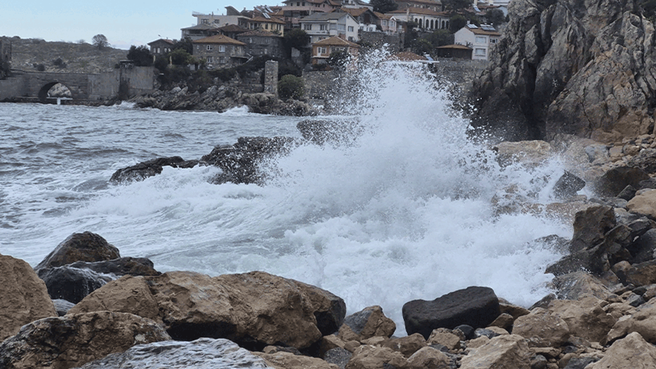 Meteoroloji Genel Müdürlüğü tarafından fırtına uyarısının yapıldığı Bartın'ın Amasra ilçesinde şiddetli rüzgar etkili oluyor. Saatte hızı zaman zaman 75 kilometreye ulaşan rüzgar nedeniyle denizde dev dalgalar oluşuyor. Kayalara çarpan dalgaların boyu 4 metreye ulaşıyor.