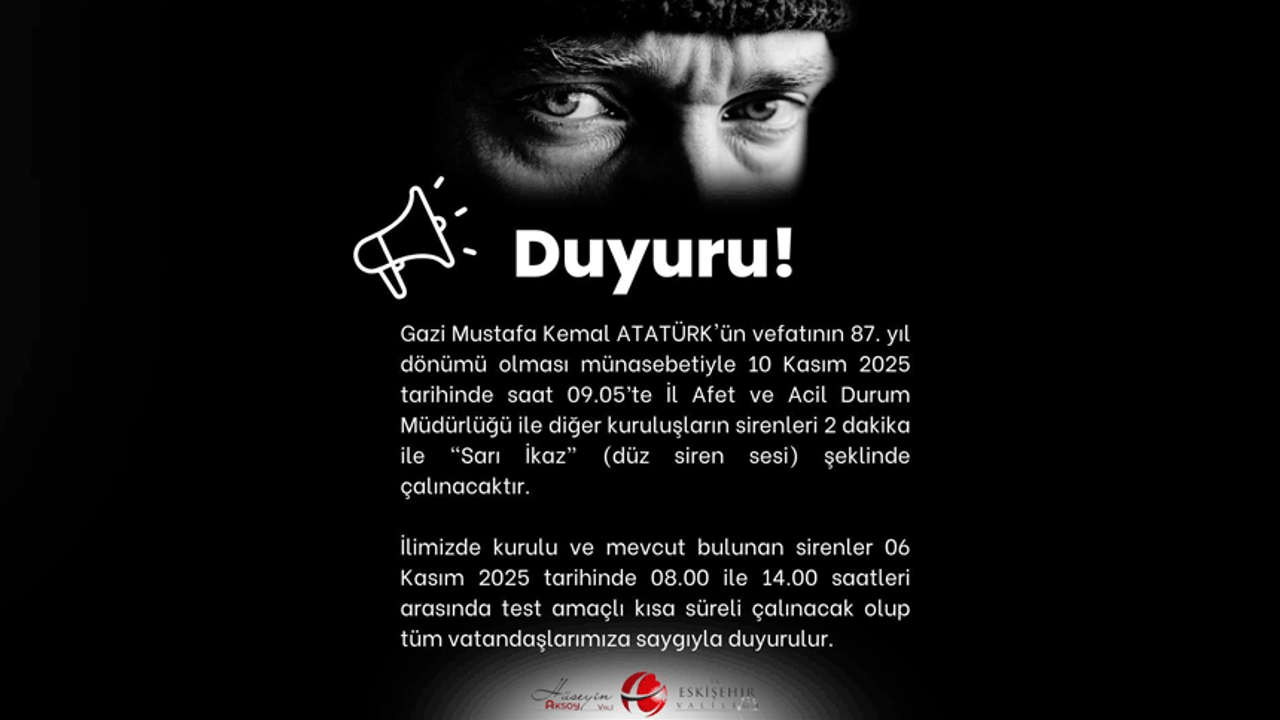 İl Afet ve Acil Durum Müdürlüğü koordinasyonunda yapılacak uygulamada, 2 dakika boyunca “Sarı İkaz” olarak bilinen düz siren sesi kullanılacak. Ayrıca, 06 Kasım 2025 tarihinde 08.00–14.00 saatleri arasında siren sistemlerinin test amaçlı kısa süreli çalıştırılacağı belirtildi. Valilik, vatandaşların bu seslere karşı hazırlıklı olmalarını ve paniğe kapılmamaları istendi.
