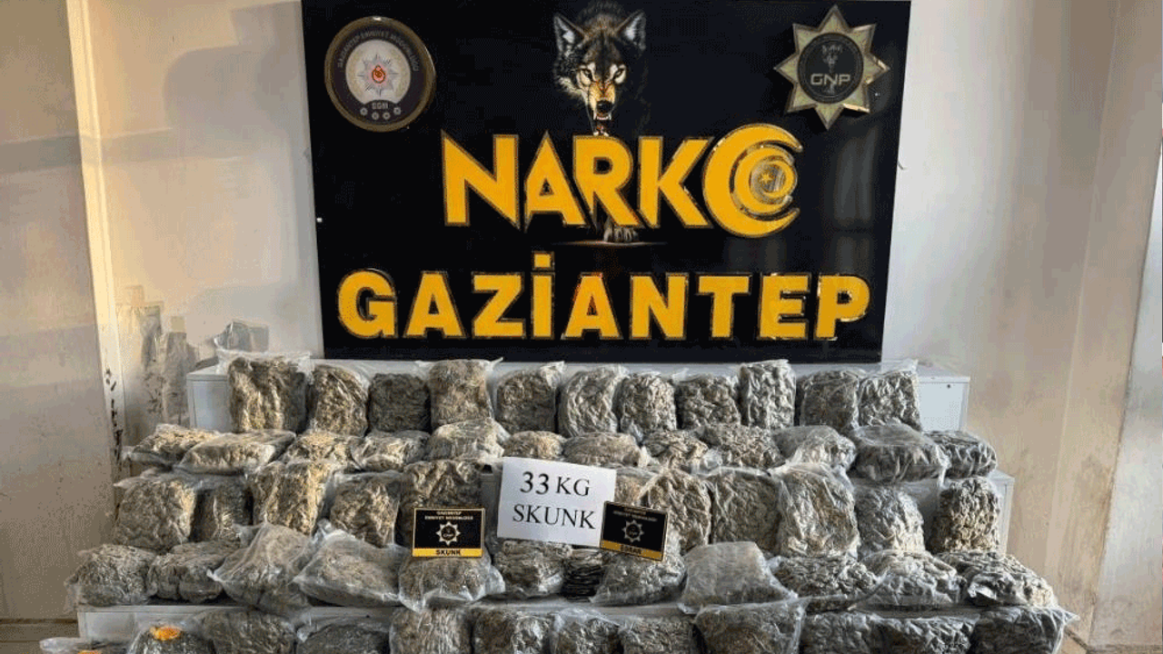 Gaziantep'te İl Emniyet Müdürlüğü Narkotik Suçlarla Mücadele Şube Müdürlüğü ekipleri ve Cumhuriyet Başsavcılığı koordinesinde uyuşturucu operasyonu yapıldı. Operasyon çerçevesinde, belirlenen şüpheli bir tırda arama yapıldı. Hassas burunlu dedektör köpek destekli aramalar sonucunda tırın dorsesine gizlenmiş zula halinde 33 kilo 500 gram skunk ve 450 gram esrar ele geçirildi. Operasyon sonucunda 1 şüpheli şahıs gözaltına alındı.