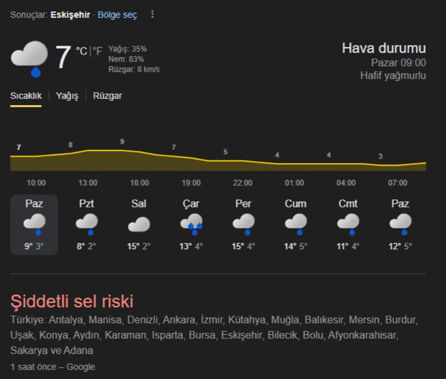Arama motoru üzerinden Eskişehir hava durumunu kontrol eden kullanıcılar, “şiddetli sel riski” uyarısıyla karşılaşıyor. Google’ın Flood Hub platformu verilerine göre, Eskişehir’in de yer aldığı bölgede büyük çaplı ve nadir görülebilecek bir sel ihtimali bulunuyor. Yetkililer, Çarşamba gününden itibaren sel riskinin artabileceğini belirtiyor.
