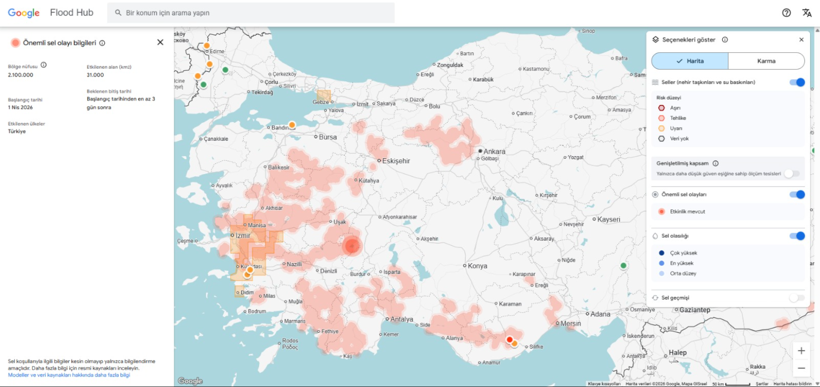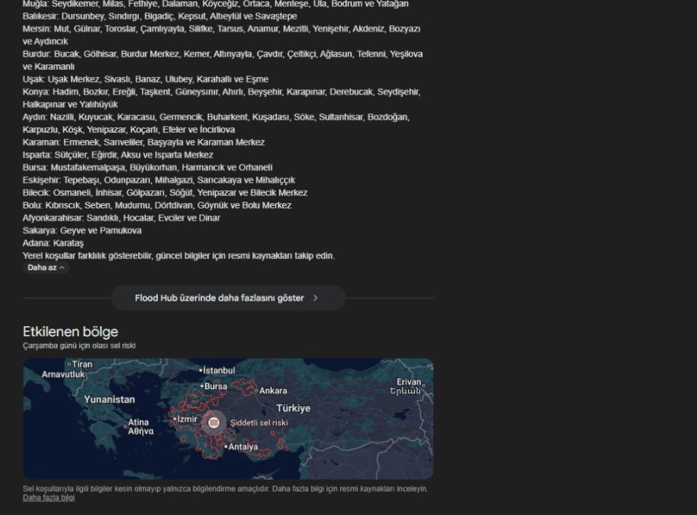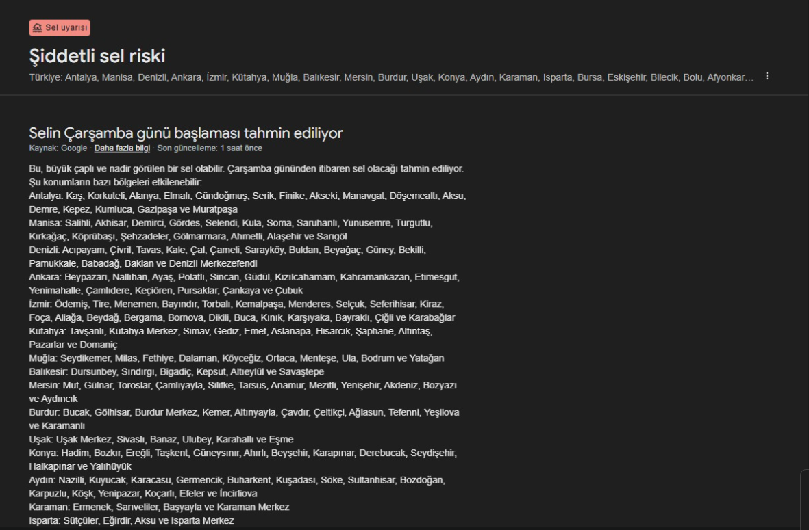 Google’ın uyarı metninde “Bu, büyük çaplı ve nadir görülen bir sel olabilir. Çarşamba gününden itibaren sel olacağı tahmin ediliyor” ifadeleri yer alıyor.
