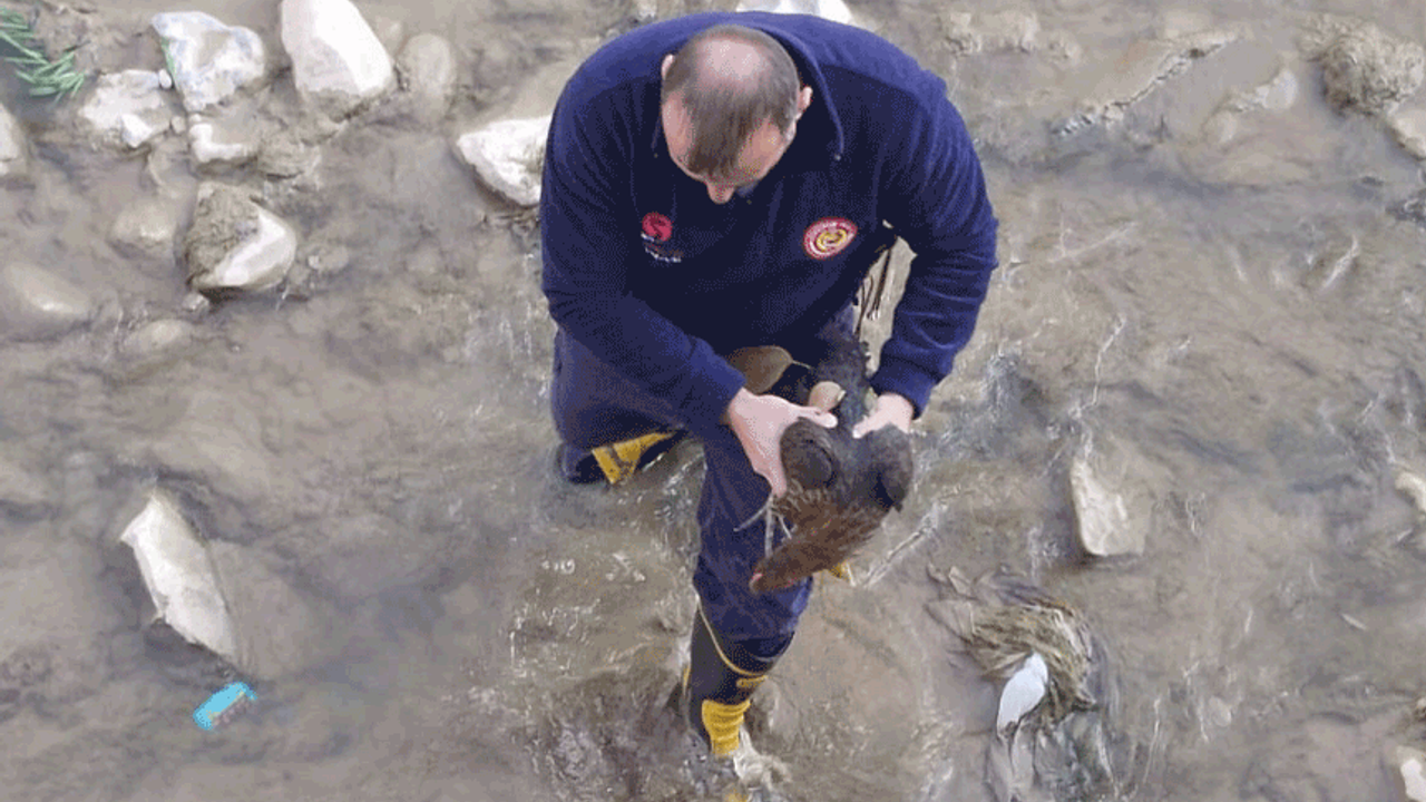 Gümüşhane Belediyesi itfaiye ekiplerinden Mustafa Soydaş, merdiven yardımıyla çaya inerek tavuğu bulunduğu yerden aldı. Kurtarılan tavuk daha sonra sahibine teslim edildi.