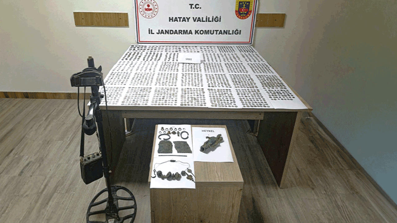 Hatay İl Jandarma Komutanlığı ekiplerince 18 Nisan tarihinde Antakya ilçesi Karlısu Mahallesi’nde A.A., S.G. ve A.A. isimli şahısların ikametlerinde yapılan aramada bin 988 adet çeşitli dönemlere ait olduğu değerlendirilen sikke,17 adet tarihi eser niteliği taşıyan obje, Roma dönemine ait olduğu değerlendirilen 1 adet heykel,1 adet dedektör ele geçirildi.