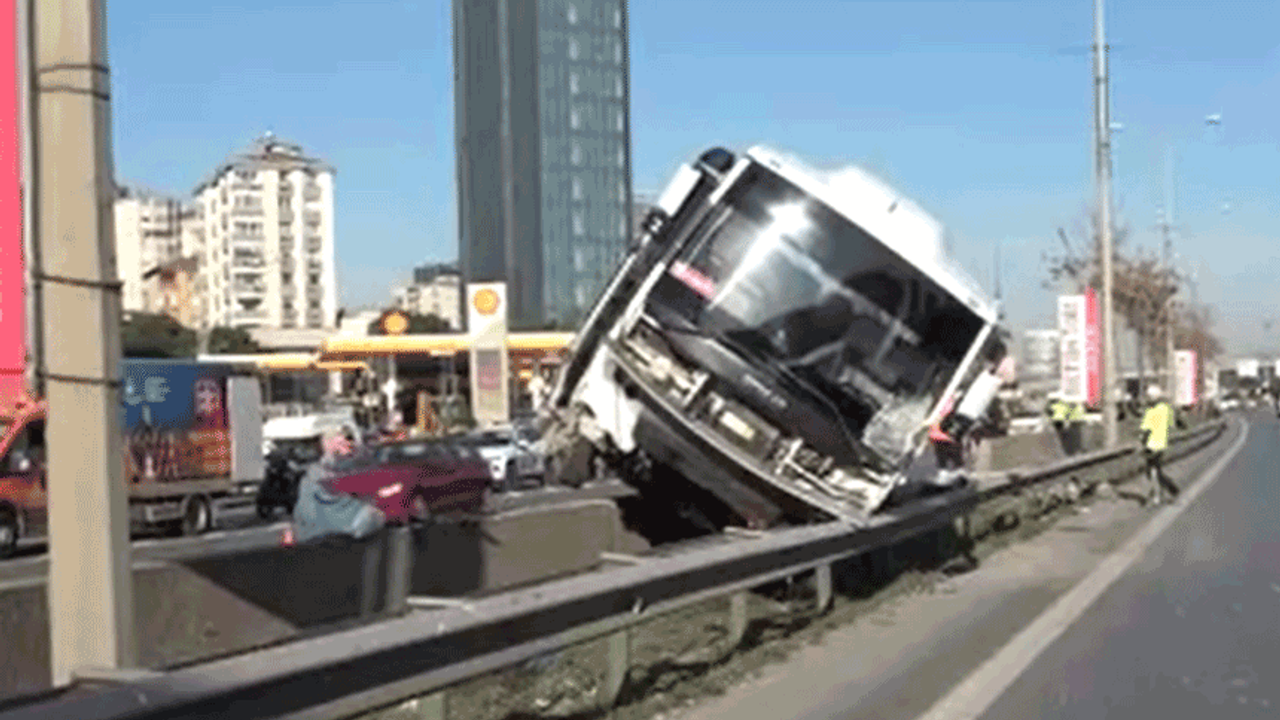 İstanbul'da servis otobüsü beton bariyer üzerinde havada asılı kaldı