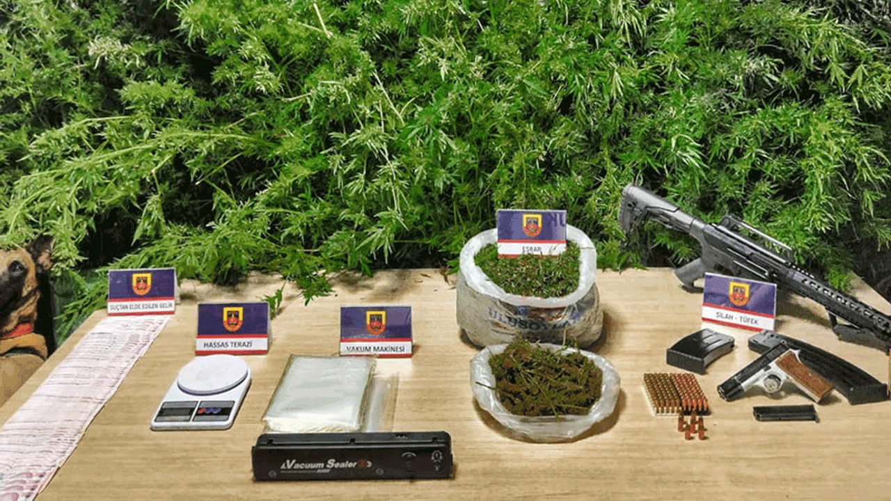 Edinilen bilgiye göre, jandarma ekipleri tarafından 3 şüphelinin bulunduğu bir çiftlikte ve çiftliğin bitişiğindeki ormanlık alanda yapılan, narkotik köpeği Eklem'in de katıldığı aramada, 56 kök skunk bitkisi, 4,63 gram kubar esrar, 2 gram kenevir tohumu, 1 vakum makinası, 119 vakum ambalaj poşeti, 1 hassas terazi, 13 eldiven, 1 ruhsatsız tabanca ve buna ait şarjör, 107 adet tabanca fişeği, 1 ruhsatsız av tüfeği, 3 av tüfeği şarjörü, 39 av tüfeği kartuşu ve suçtan elde edildiği değerlendirilen 27 bin 670 TL nakit para ele geçirildi. Ayrıca 3 cep telefonuna da incelenmek üzere el konuldu.