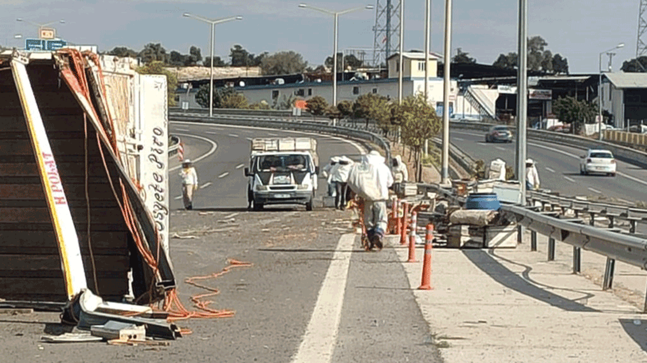 Olay, Mersin'in Toroslar ilçesi Güzeloluk Mahallesi sınırlarında Tarsus-Adana-Gazinatep (TAG) otoyolu çıkışında meydana geldi. Alınan bilgiye göre, sürücüsünün direksiyon hakimiyetini kaybettiği arı dolu kovan yüklü kamyon devrildi. Kazada araçta bulunan 3 kişi yaralandı, binlerce arı ise yola saçıldı. Kazayı görenlerin haber vermesi üzerine olay yerine sağlık, polis ve Mersin Arıcılar Birliğinden arıcılar gönderildi. Yaralılar ambulansla hastaneye sevk edilirken, etrafa yayılan binlerce arıya gönüllü arıcılar müdahale etti. Kovanlara alınan arılar, güvenli bir alana taşındı.