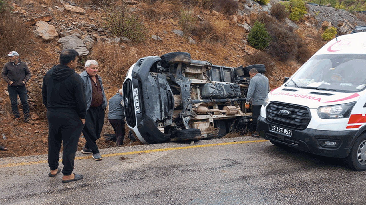 Kaza, Mersin Esenpınar Mahallesi Ağlıca mevkiinde meydana geldi. Alınan bilgiye göre, Erdemli istikametine seyreden A.T. yönetimindeki elma yüklü 33 VG 386 plakalı kamyonet, yağışla kayganlaşan yolda sürücüsünün direksiyon hakimiyetini kaybetmesiyle şarampole devrildi. Kazada sürücü ile birlikte araçtaki yolcular S.T. ve H.P. yaralandı. Diğer sürücülerin haber vermesiyle kaza yerine ambulans, itfaiye ve jandarma ekipleri sevk edildi. Yaralılar, ambulanslarla ilçe devlet hastanesi acil servisine kaldırıldı.