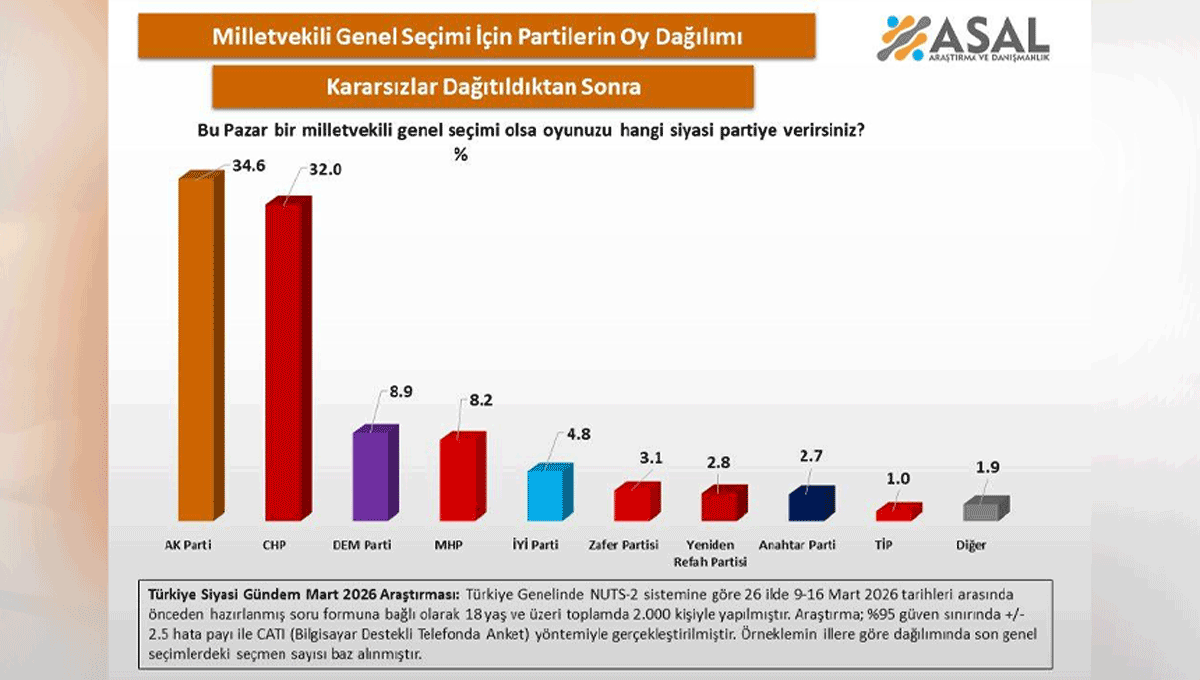 ASAL Araştırma tarafından yapılan ankette AK Parti yüzde 34.6 ile birinci parti olurken, CHP ise 32.0 ile ikinci parti oldu.