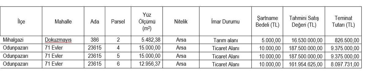 Konuyla ilgili açıklamada, mülkiyeti kuruma ait olan Mihalgazi ilçesinde 1 tarım alanı ile Odunpazarı ilçesinde ticari alan içindeki 3 arsa için kurumun internet sitesinde yer alan Elektronik Satış Portalı üzerinden açık artırma usulü ile 17-28 Kasım 2025 tarihleri arasında satış ihalesi yapılacağı belirtildi.